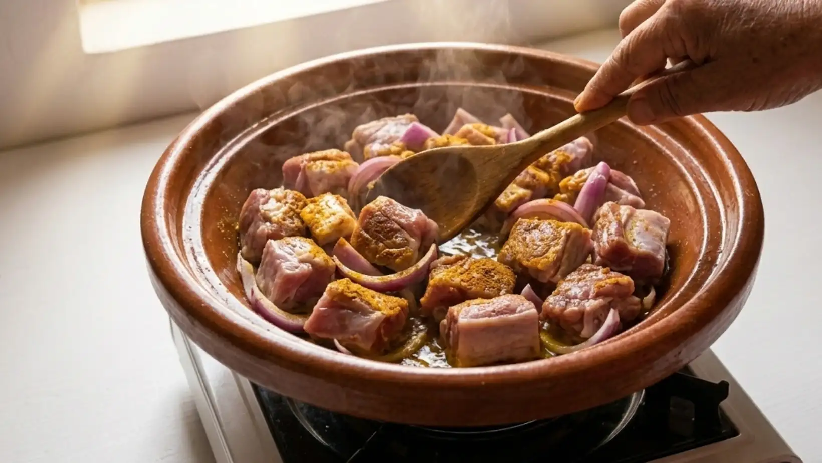 In the base of your clay tagine, heat a generous drizzle of extra virgin olive oil. Add the meat cubes and sliced onions, stirring gently with a wooden spoon. This searing process locks in the juices and allows the spices to toast slightly, releasing their essential oils and filling your kitchen with the legendary scent of a traditional Moroccan tagine recipe.